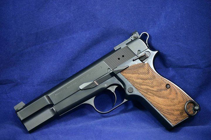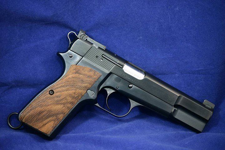 Custom Browning Hi Power. Upgraded internals, trigger job, deluxe mounted Bo Mar style rear sight and fitted Barsto barrel. Finish is polished blue.