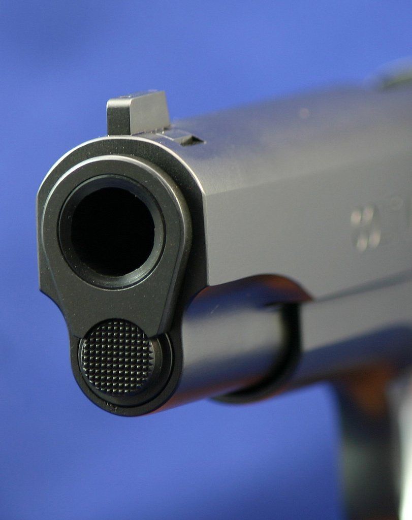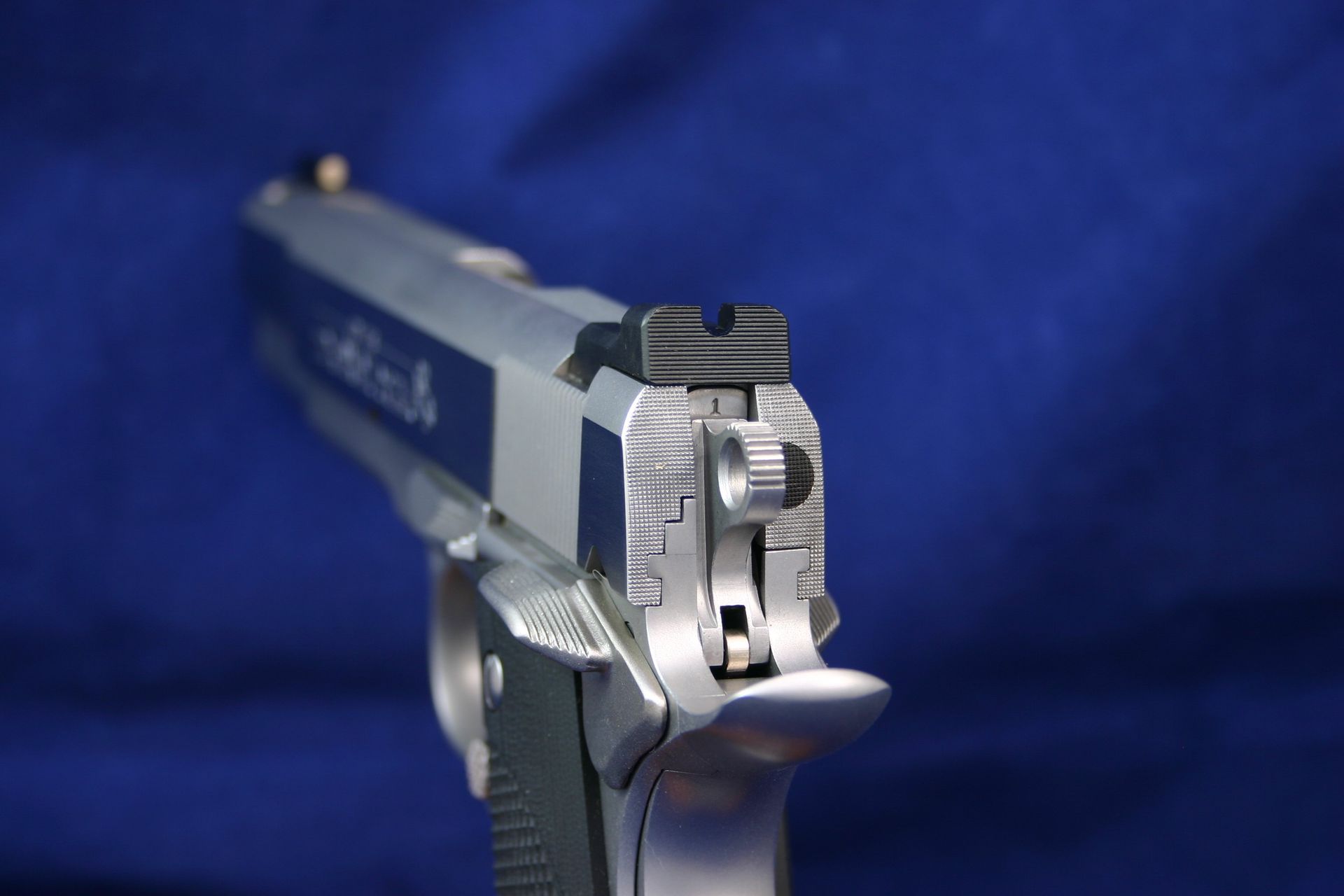 Custom stainless Colt 1911 left side view.