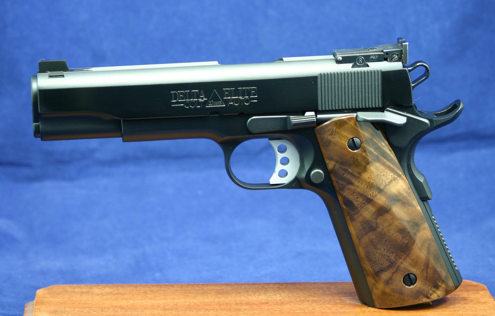 Custom Colt Government. Features tightened slide/ frame fit, match grade barrel and bushing, fitted trigger, trigger job, reliability package, 10-8 rear sight and fiber optic front. The front has 30 LPI hand cut checkering. The finish is Ionbond DLC over stainless steel.