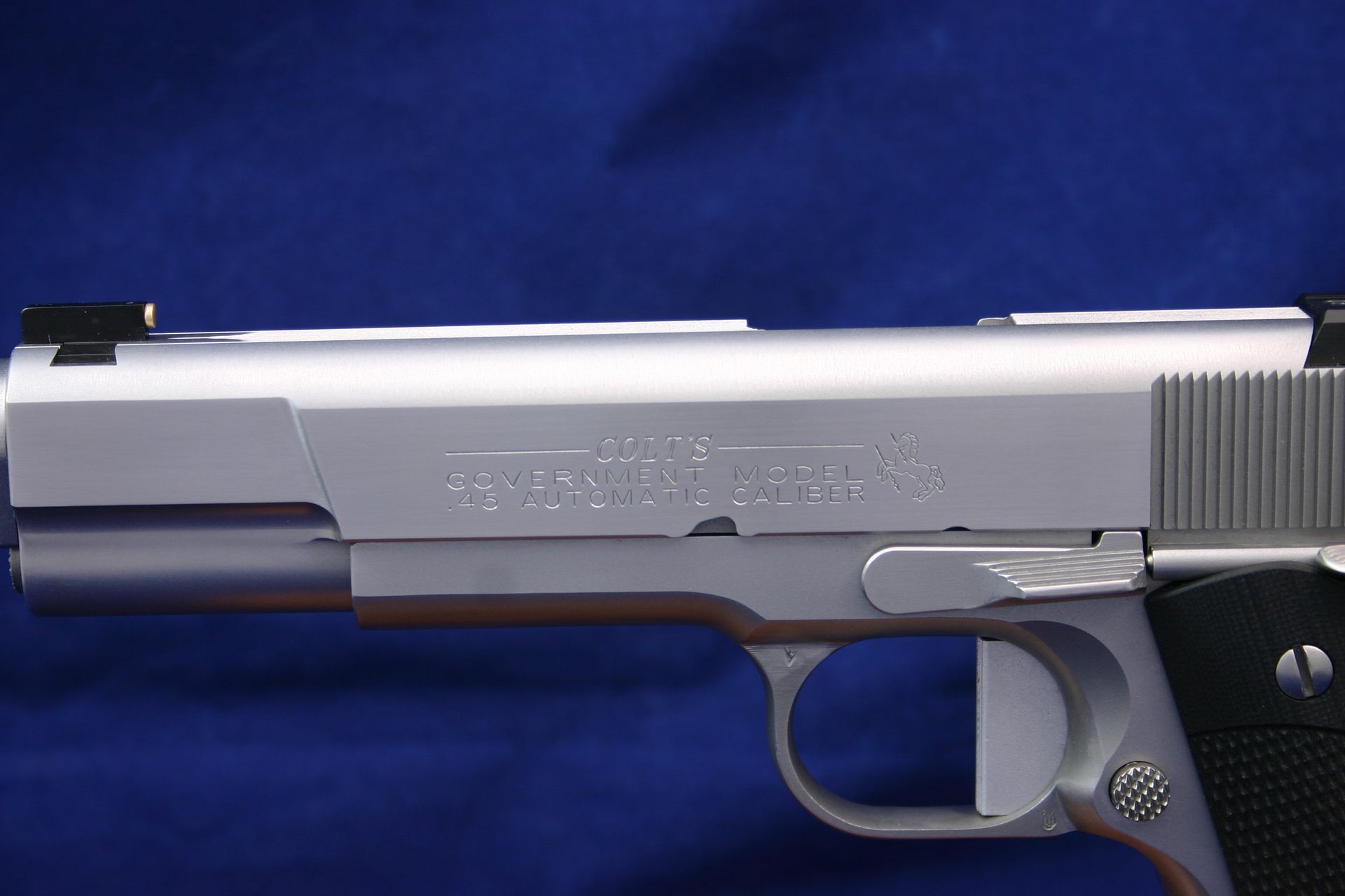Custom Colt Government Model. Features tightened slide/ frame fit, match bushing, ball cut slide, pointed top serrations, trigger job and Novak sights. Finish is 400 grit polished slide and satin frame.