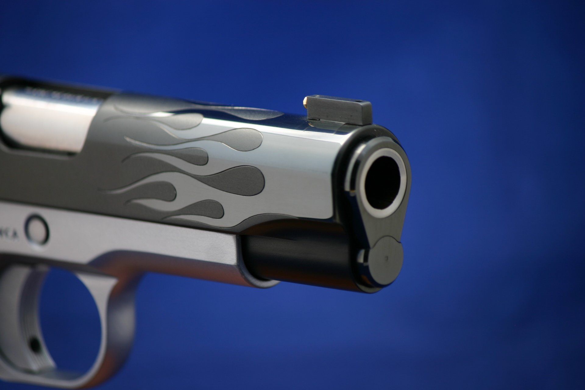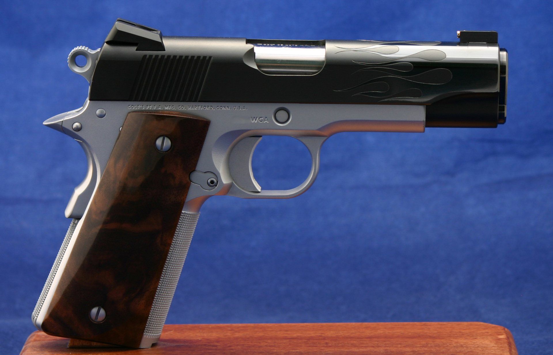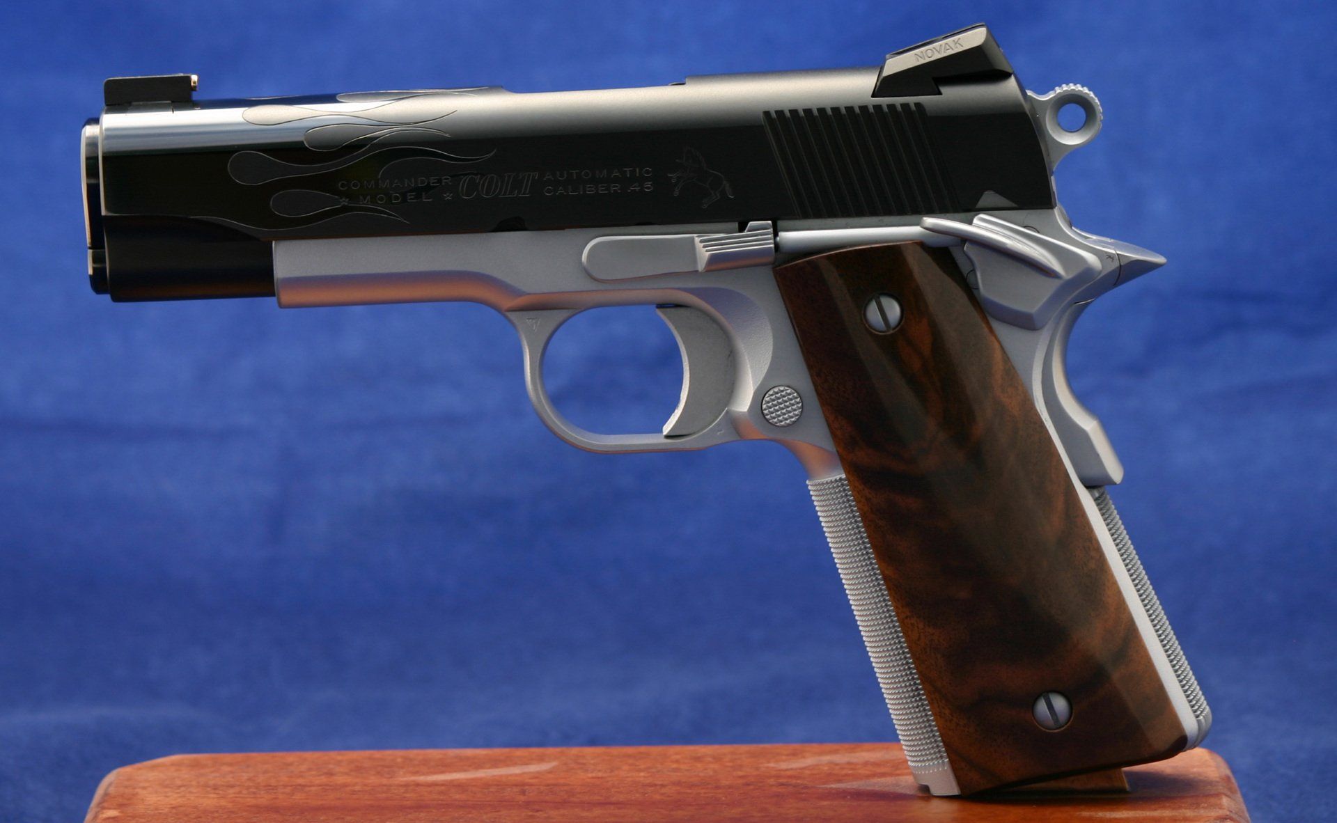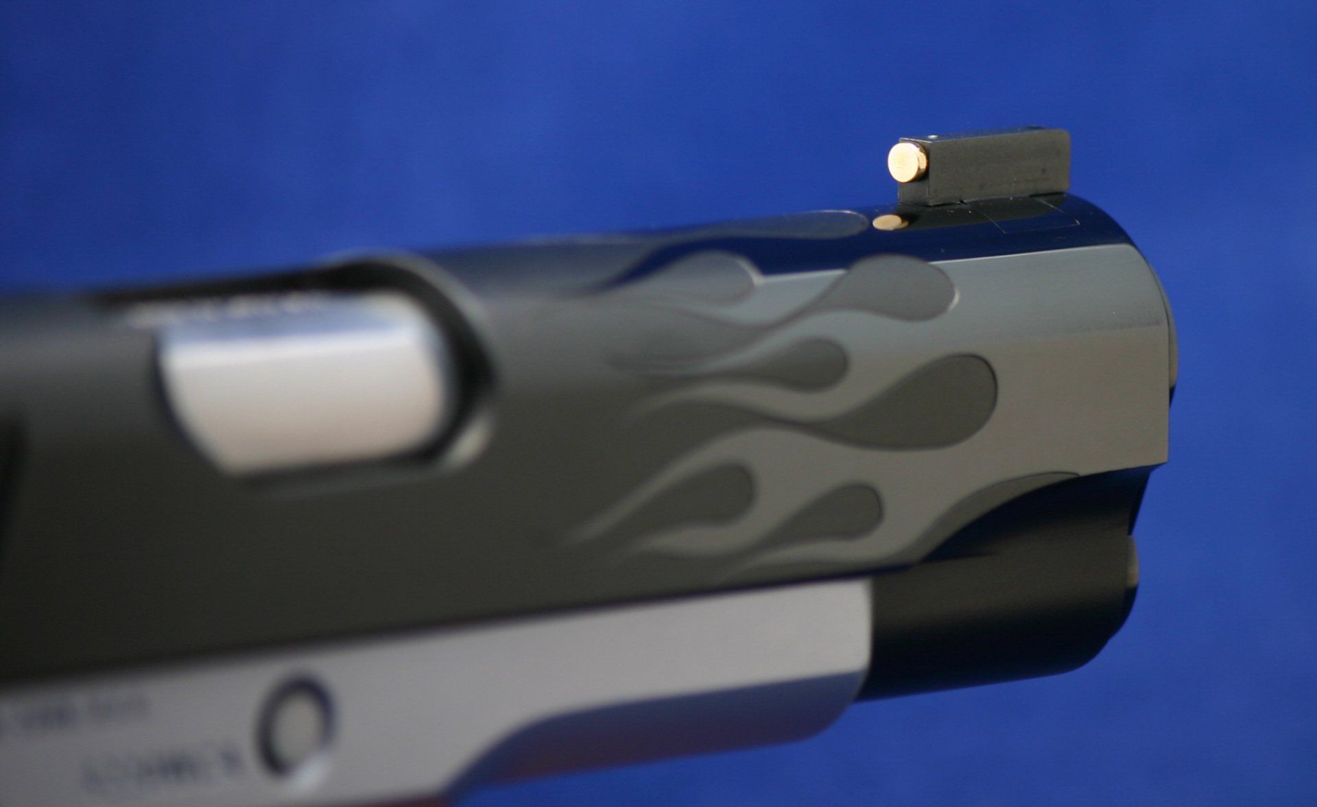 Custom Colt 1911, the Hot Rod. Features fitted trigger, trigger job, reliability package, upgraded safeties, Novak rear sight, gold line front sight and engraved flames. Finish is satin blue with high polished flames.